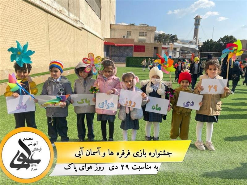 کودکستان علوی مقارن با 29 ام دی ماه و روز جهانی هوای پاک جشنواره بازی با عنوان ((فرفره ها و آسمان آبی )) را برگزار نمود.در این جشنواره ضمن آموزش اهمیت هوای پاک و آشنایی با آلاینده های هوا نوگلان با مسئولیت اجتماعی شان در حفظ و نگهداشت کره زمین آشنا شدند و ساعاتی هیجان انگیز را در این جشنواره بازی تجربه نمودند .